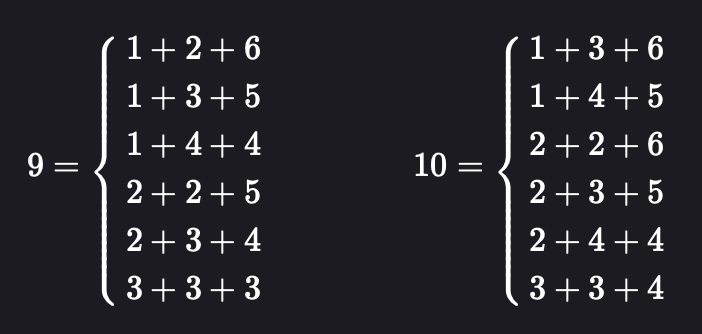 Les deux ont donc bel et bien 6 combinaisons différentes, mais la différence critique c’est qu’il ne faut pas se fier à ces combinaisons la, en réaliter il faut compter le nombre de combinaisons en prenant en compte l’ordre, c’est à dire que 1+2+6 n’est pas égal à 2+6+1 ou 6+1+2. Et donc en reprenant les comptes, pour faire 9 il y à 25 combinaisons et pour faire 10 il y en à 27, et leur probabilités respectives sont: